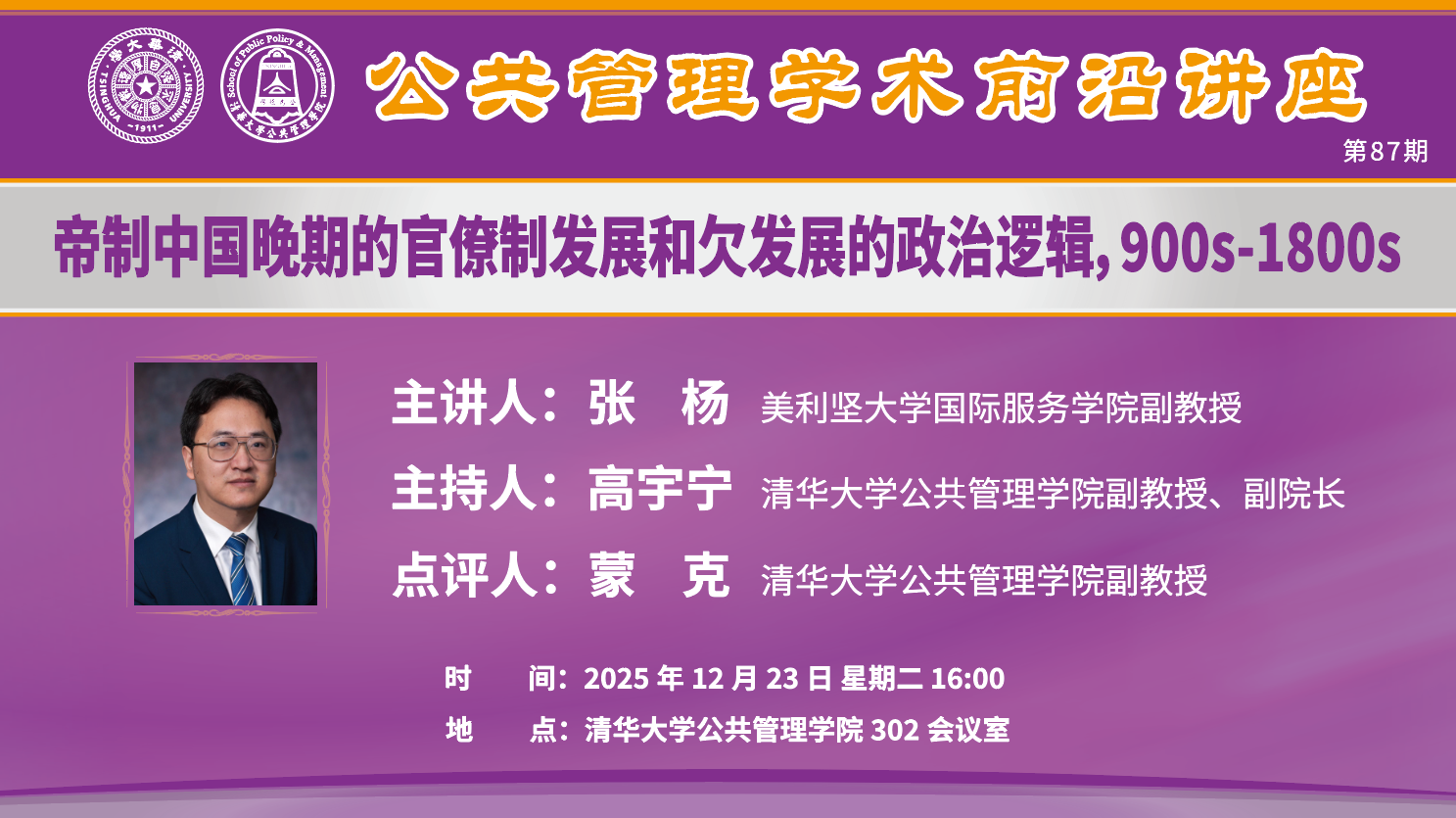 公共管理學(xué)術(shù)前沿講座第87期:帝制中國(guó)晚期的官僚制發(fā)展和欠發(fā)展的政治邏輯,900s-1800s。(2025年12月23日 星期二 16:00)